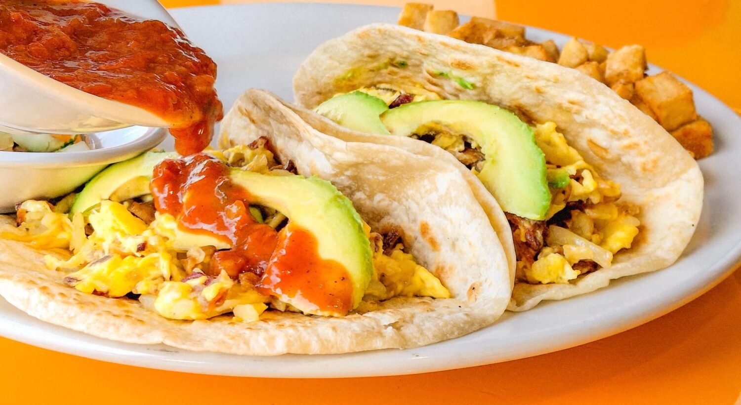 Enjoy two delicious tacos on flour tortillas filled with scrambled eggs, crispy hashbrowns, fresh pico de gallo, and a slice of creamy avocado. Choose your favorite meat and pair it with a side of seasoned potatoes and our homemade sauce.
